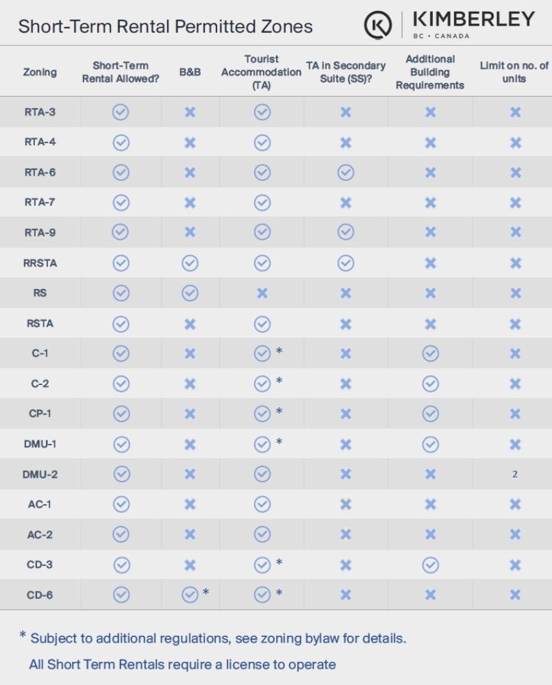 Please see below for a listing of zoning types within Kimberley that allow short-term rentals. For zone descriptions and more detailed requirements where applicable, please see Zoning Bylaws Nos. 1850 & 2016. For further clarification, please contact planning@kimberley.ca.