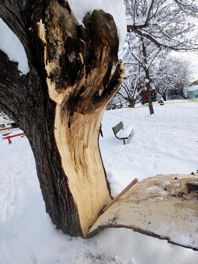 To determine the health of the tree, the City engaged the services of an ISA Certified Arborist and Qualified Tree Risk Assessor who conducted a thorough assessment of the remaining structure. The inspection revealed multiple concerns such as the identification of the included bark defect in other branch unions, poor trunk-to-branch ratio, and the presence of numerous pieces of deadwood throughout the canopy. The risk assessment concluded that given the size of the tree, the large diameter of its branches, and its location in a high-use recreation area adjacent to a playground, the consequences of failure would be severe under abnormal weather conditions, potentially resulting in significant injury.
